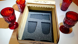 Šiam komplektui reikėjo pagaminti ir pakuotę. Kad taurės dėžutėje nesitabaluotų ir saugiai pasiektų jubiliatus - jas teko minkštai suguldyti.